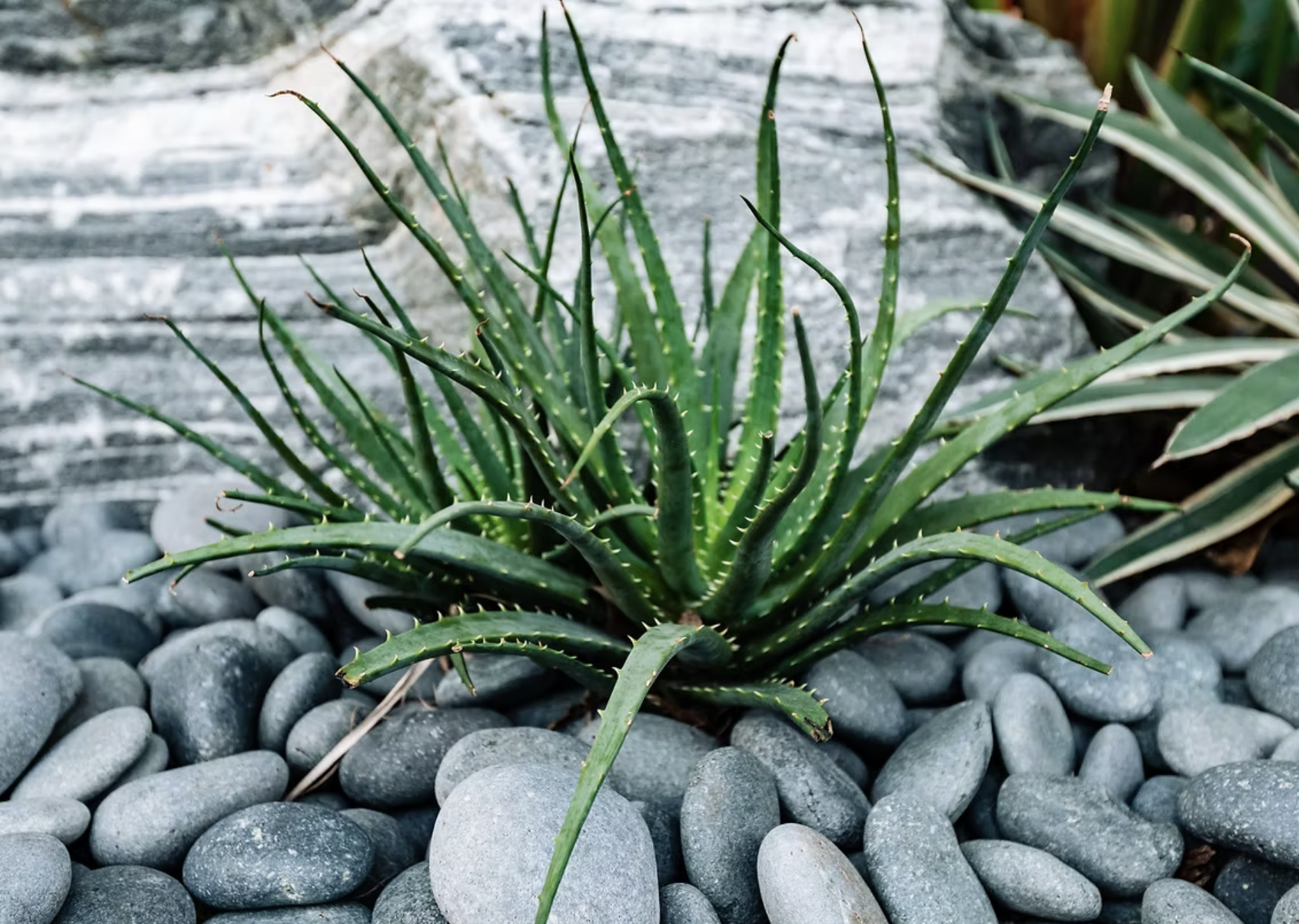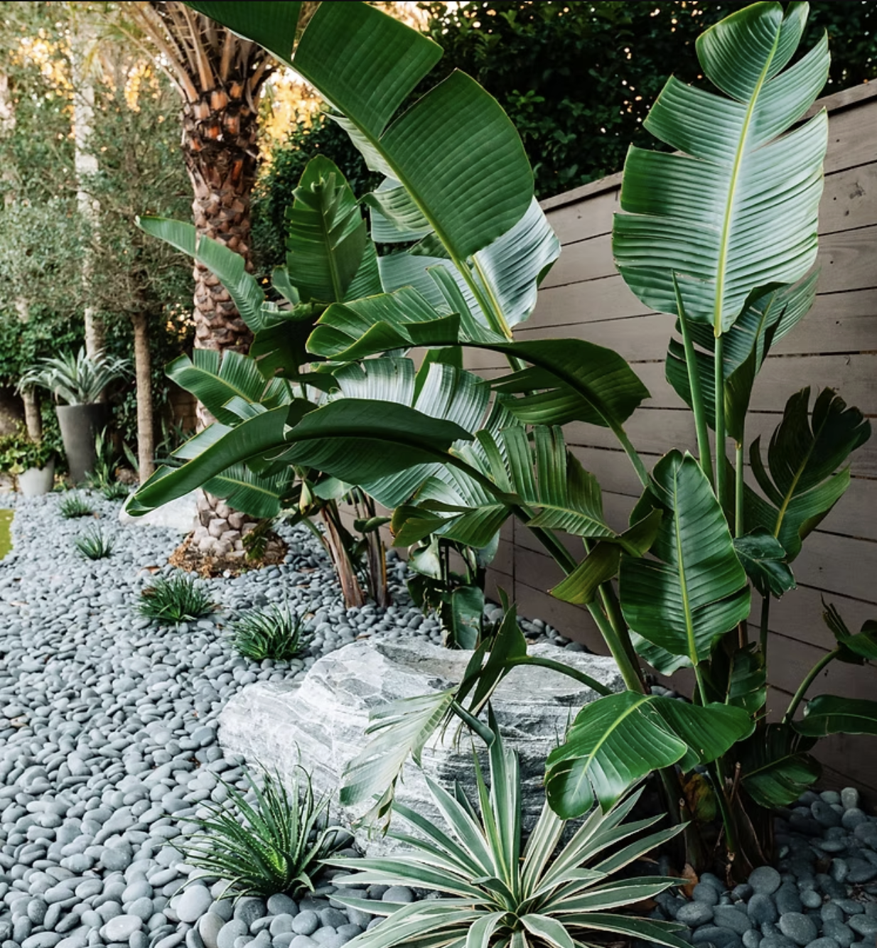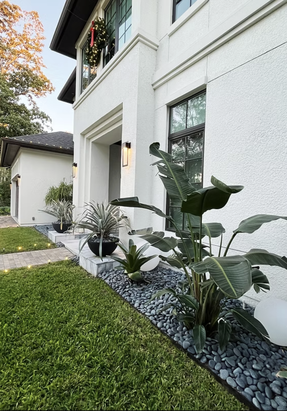 Mexican beach pebble was chosen as a primary bedding material, reinforcing the modern, minimal aesthetic the homeowners desired. Its rounded, uniform texture creates a quiet, continuous ground plane that allows architectural form and plant silhouette to stand forward.
