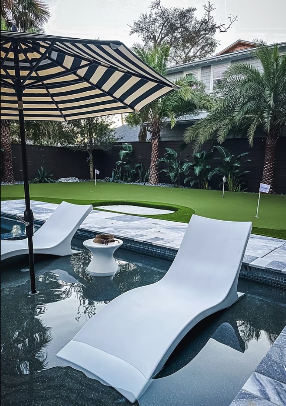 Conceived to complement a newly installed putting green, the landscape draws from an Arizona-influenced material palette while remaining appropriate to its Atlantic Beach setting. The homeowners sought a composition that felt minimal and graphic rather than lush or overtly tropical.